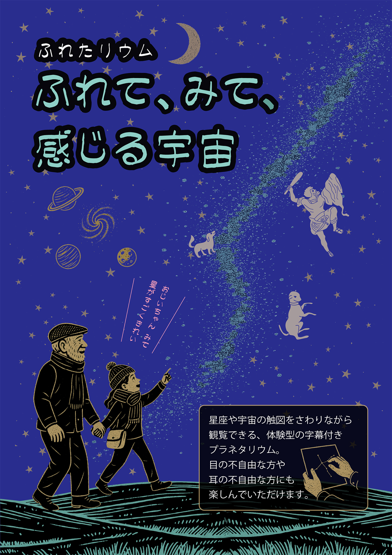 星座や宇宙の触図をさわりながら観覧できる、体験型の字幕つきプラネタリウム。星座の形や、宇宙の広がりと歴史を、ふれて、みて、感じましょう!